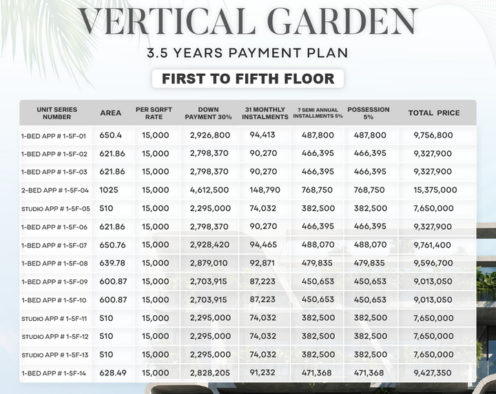 Designed to perfection, Vertical Garden features a seamless mix of premium commercial outlets and luxury residential units, including studio, 1-bed, and 2-bed apartments, as well as exclusive rooftop penthouses with breathtaking views.