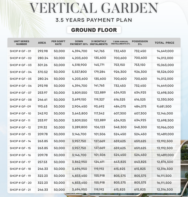 Designed to perfection, Vertical Garden features a seamless mix of premium commercial outlets and luxury residential units, including studio, 1-bed, and 2-bed apartments, as well as exclusive rooftop penthouses with breathtaking views.